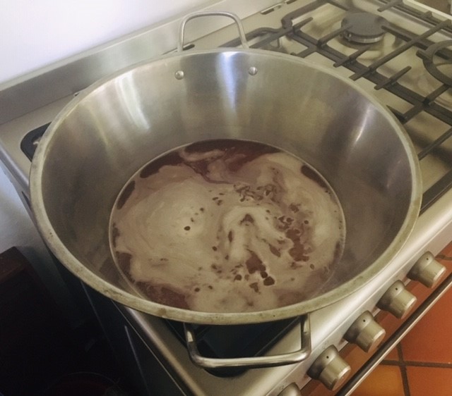 Mettez vos pots dans la grande bassine à confiture avec de l’eau chaude et ébouillantez-les. Après 10 min d’ébullition sortez-les et séchez-les avec un torchon propre. Les pots ne doivent pas contenir de bactéries qui pourraient contaminer nos gelées.