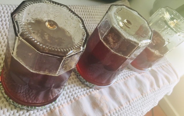 Ajoutez dans la bassine à confiture le même poids que le jus en sucre (exemple : 1 kg de jus pour 1 kg de sucre). Mélangez. Portez à ébullition. Utilisez l’écumoire pour retirer la fine coucher blanche qui se forme à la surface. Pour le temps d’ébullition, à vous de voir, il faut tester le liquide sur une surface. S’il est trop liquide et coule, continuez la cuisson, s’il se tient, vos gelées sont prêtes pour la mise en pot. Selon le sucre que l’on utilise, la cuisson et la tenue de la gelée sont différentes, ne vous loupez pas sur cette épate et soyez sûrs que le liquide tient avant la mise en pot !